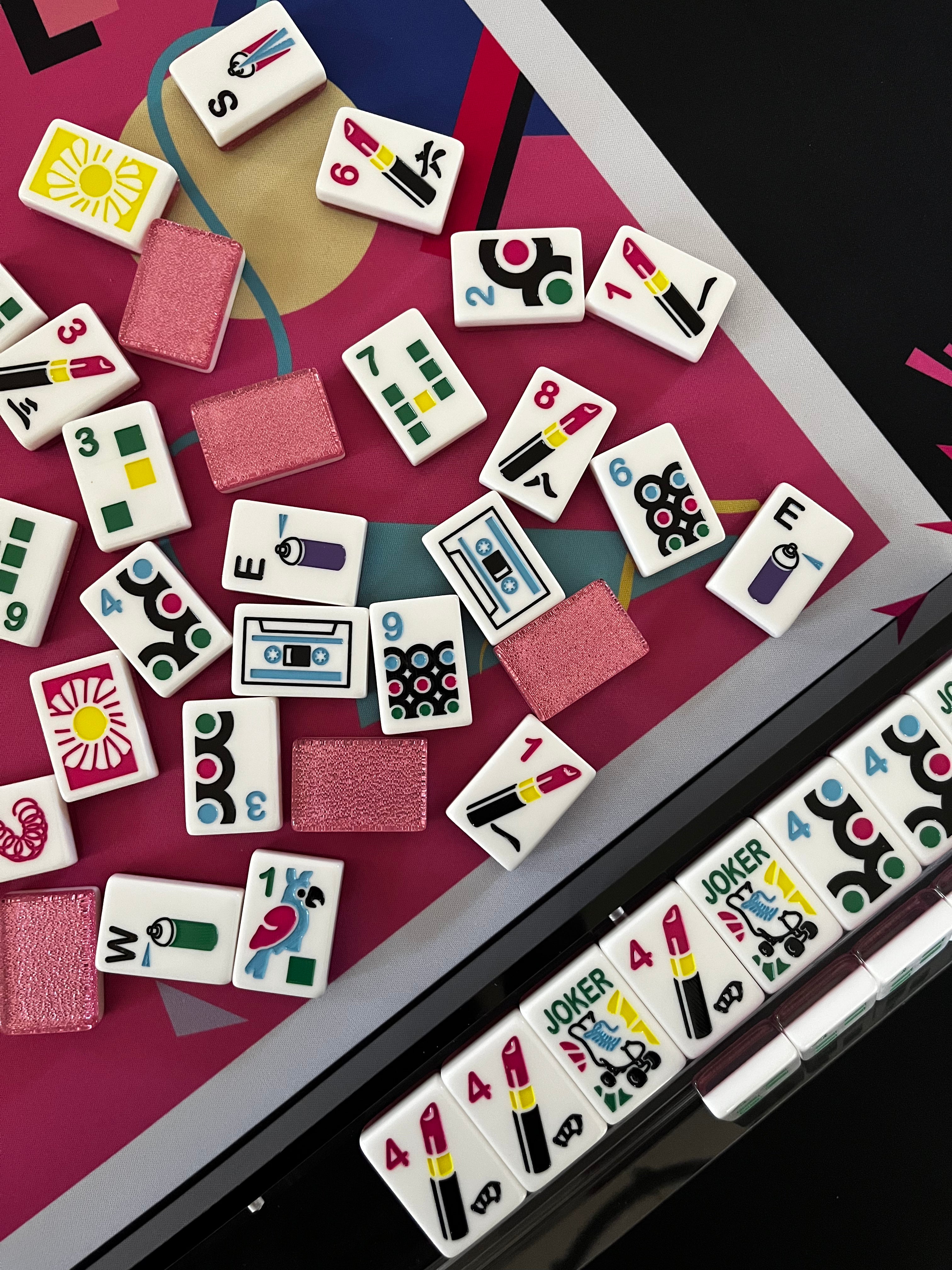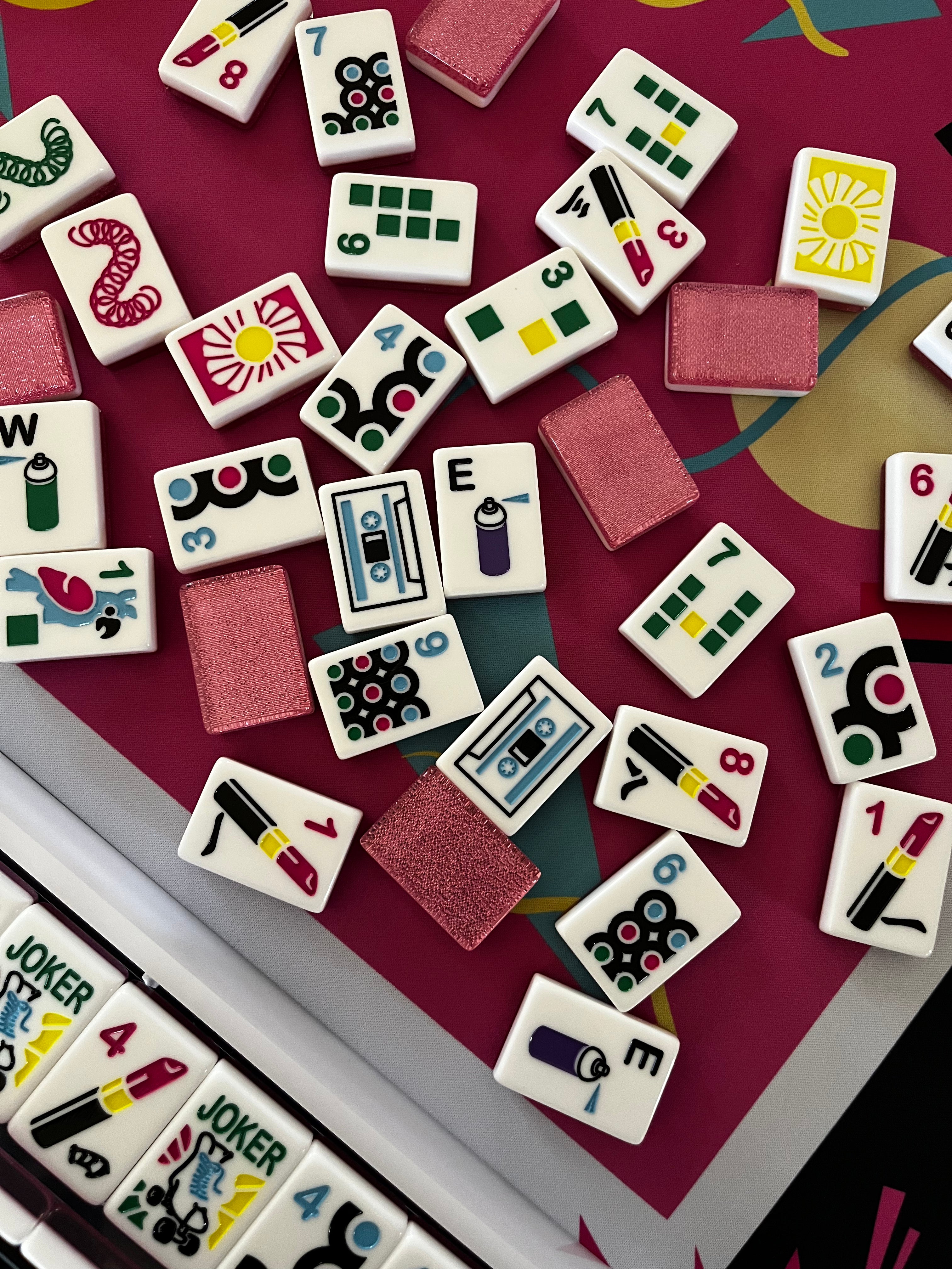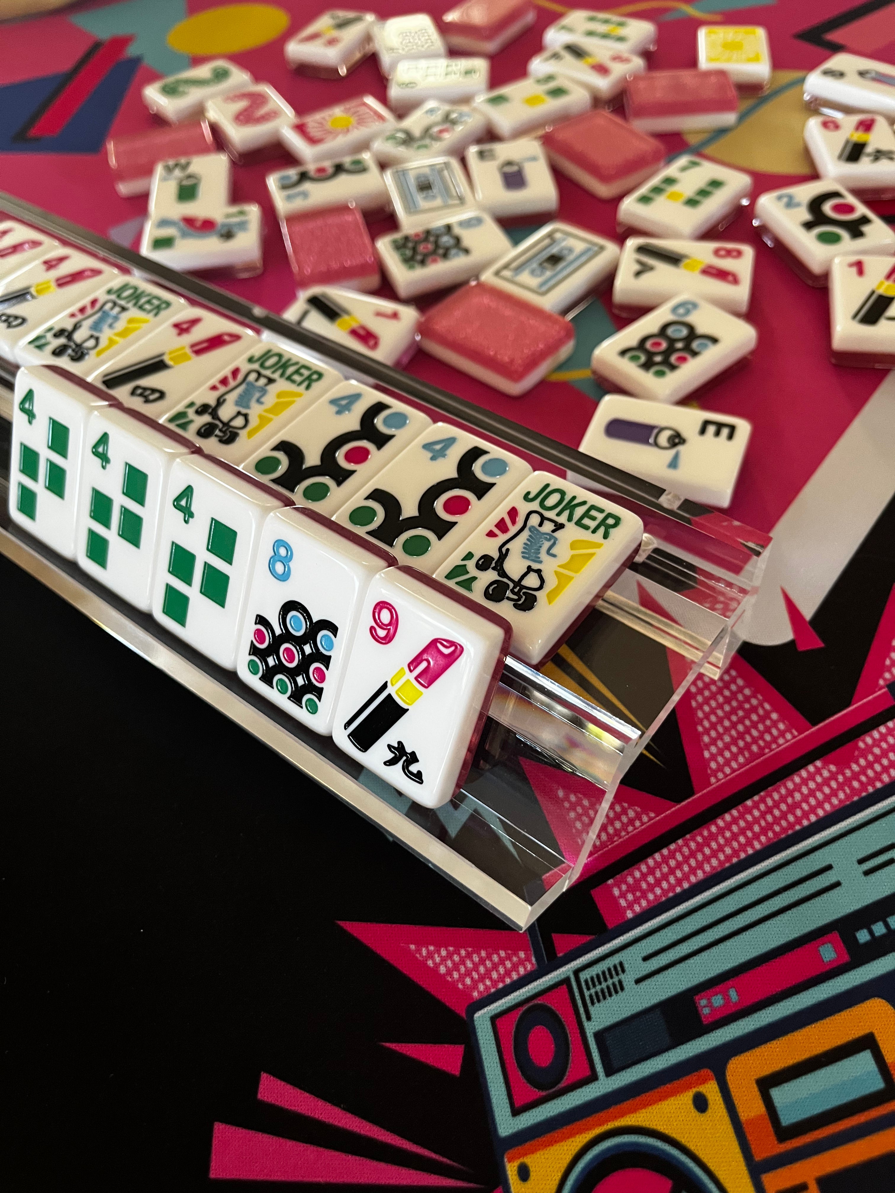 I Love the 80s Mahjong Set: Take a step back in time with the "I Love the 80s" Luxe Mahjong Set! Featuring iconic symbols like cassette tapes, Tetris blocks, lipstick, and roller skates, this American mahjong set is perfect for 80s enthusiasts. So, grab your friends, throw on your favorite 80s playlist, and let the nostalgia begin!