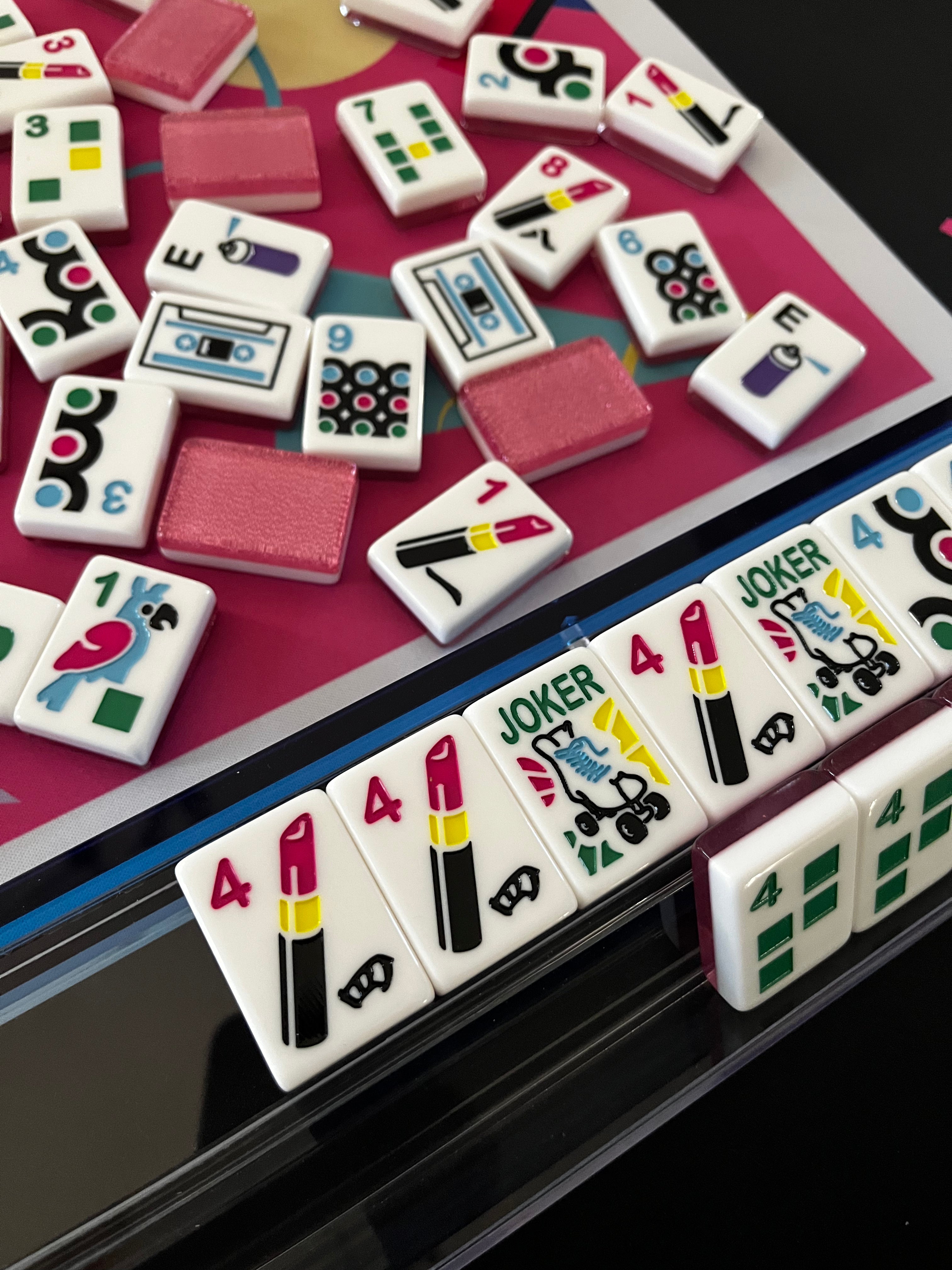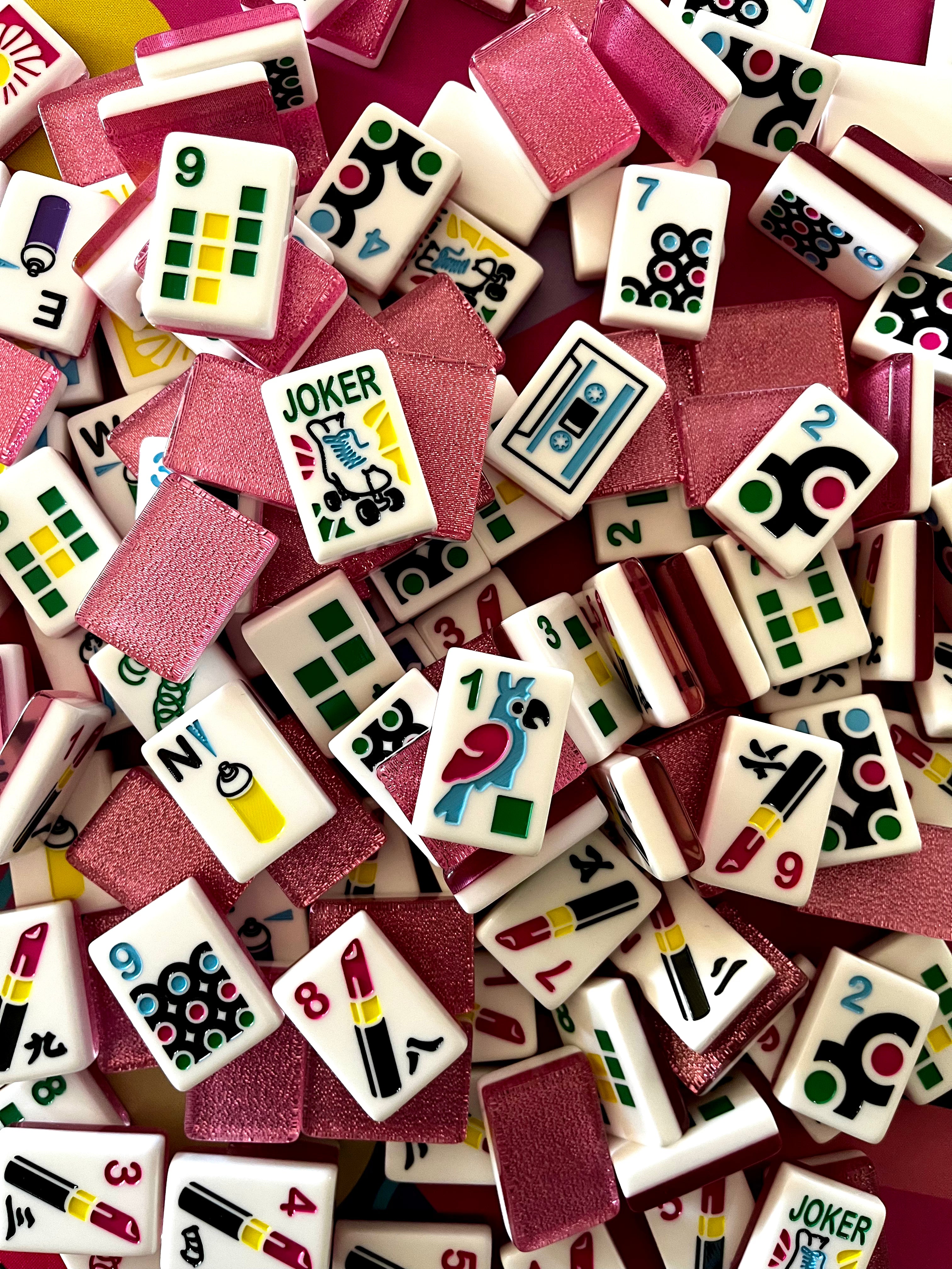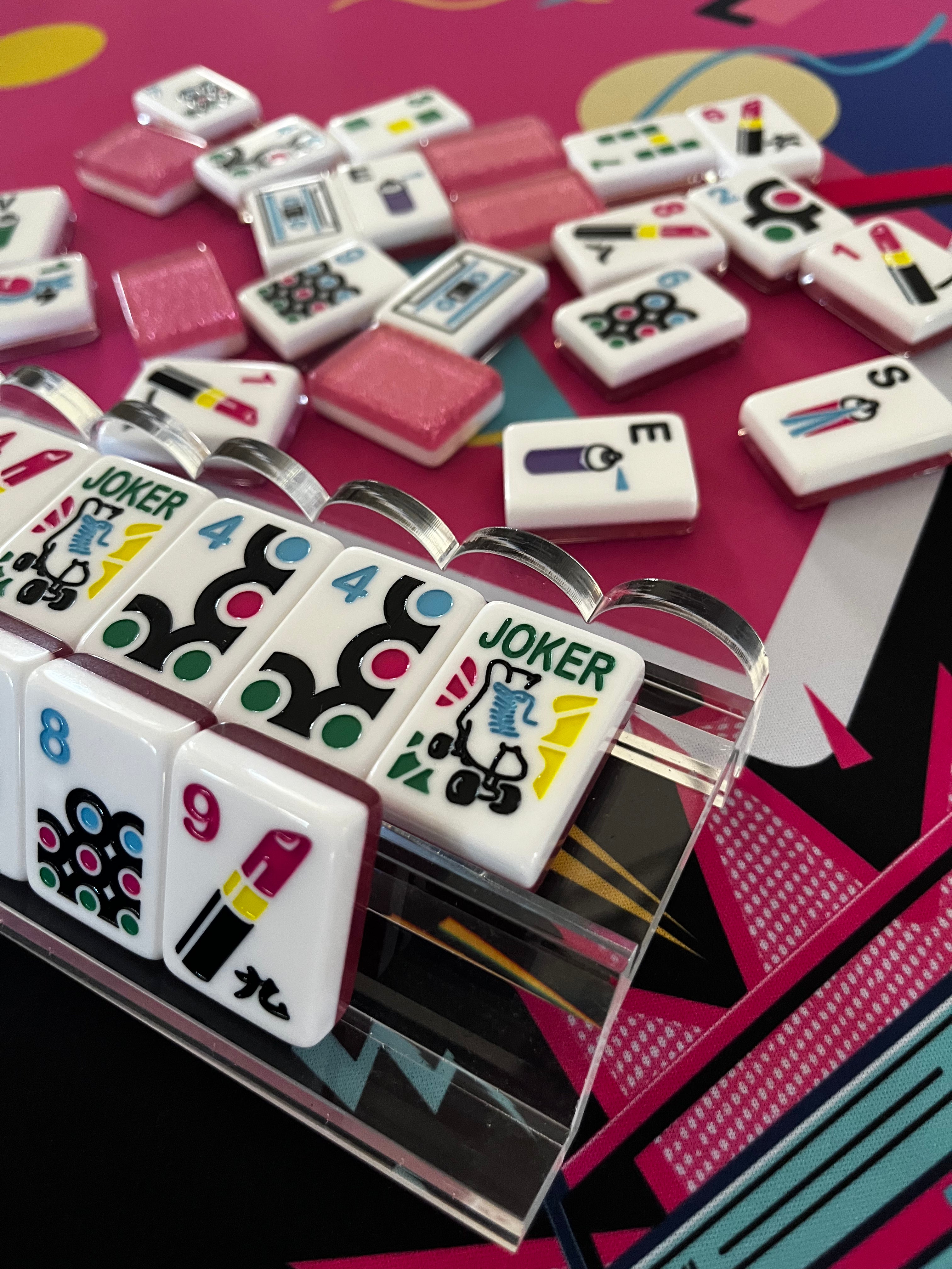 I Love the 80s Mahjong Set: Take a step back in time with the "I Love the 80s" Luxe Mahjong Set! Featuring iconic symbols like cassette tapes, Tetris blocks, lipstick, and roller skates, this American mahjong set is perfect for 80s enthusiasts. So, grab your friends, throw on your favorite 80s playlist, and let the nostalgia begin!