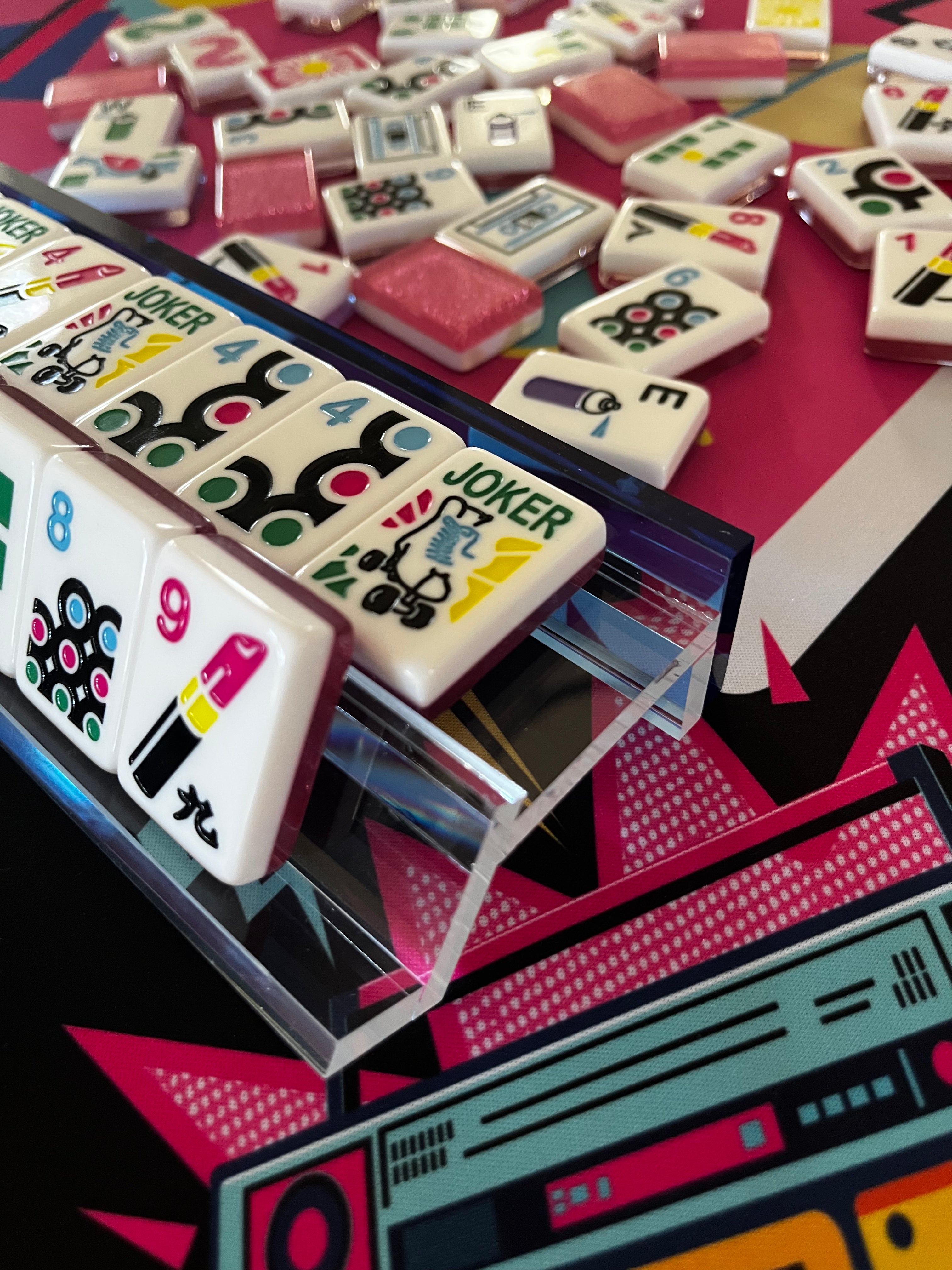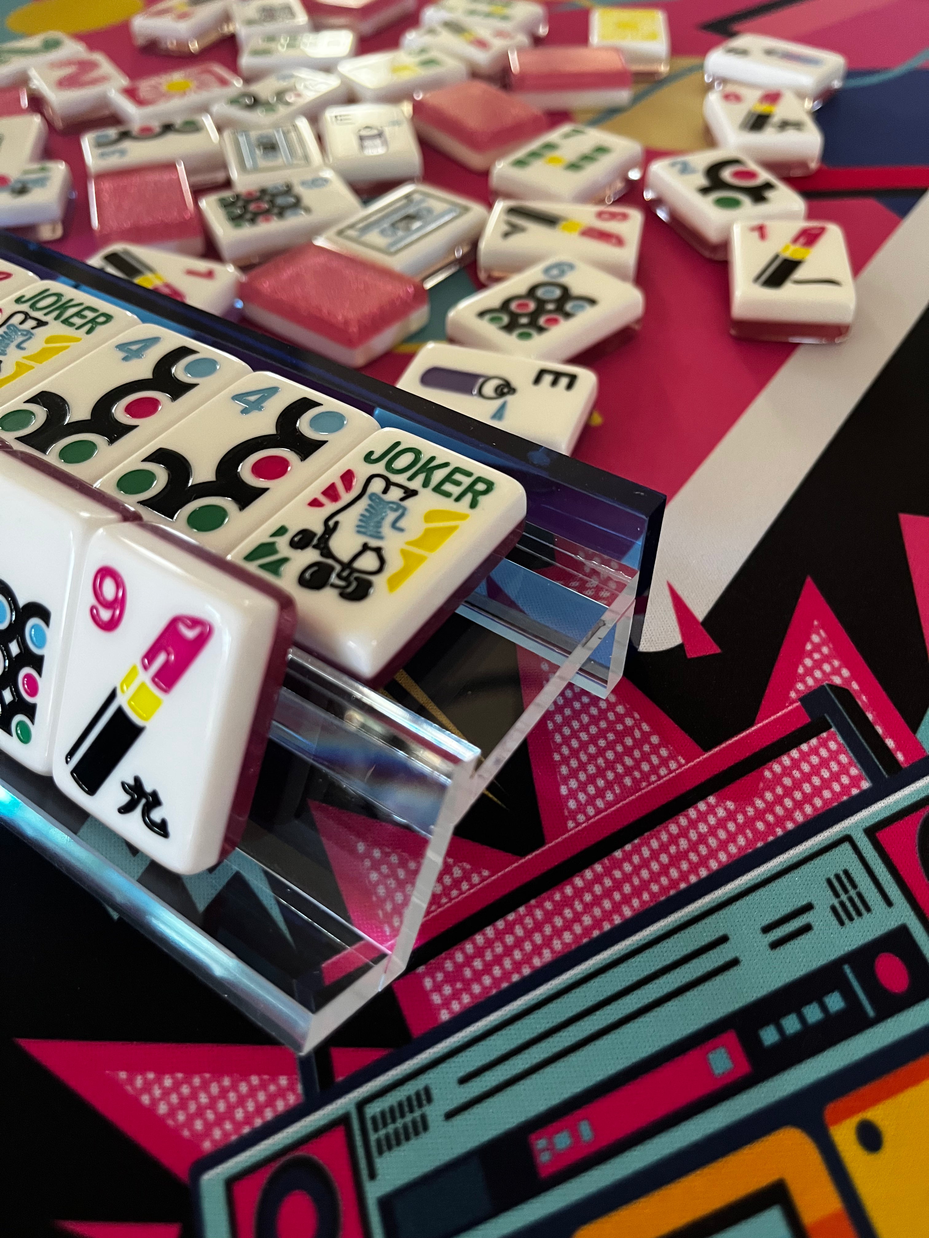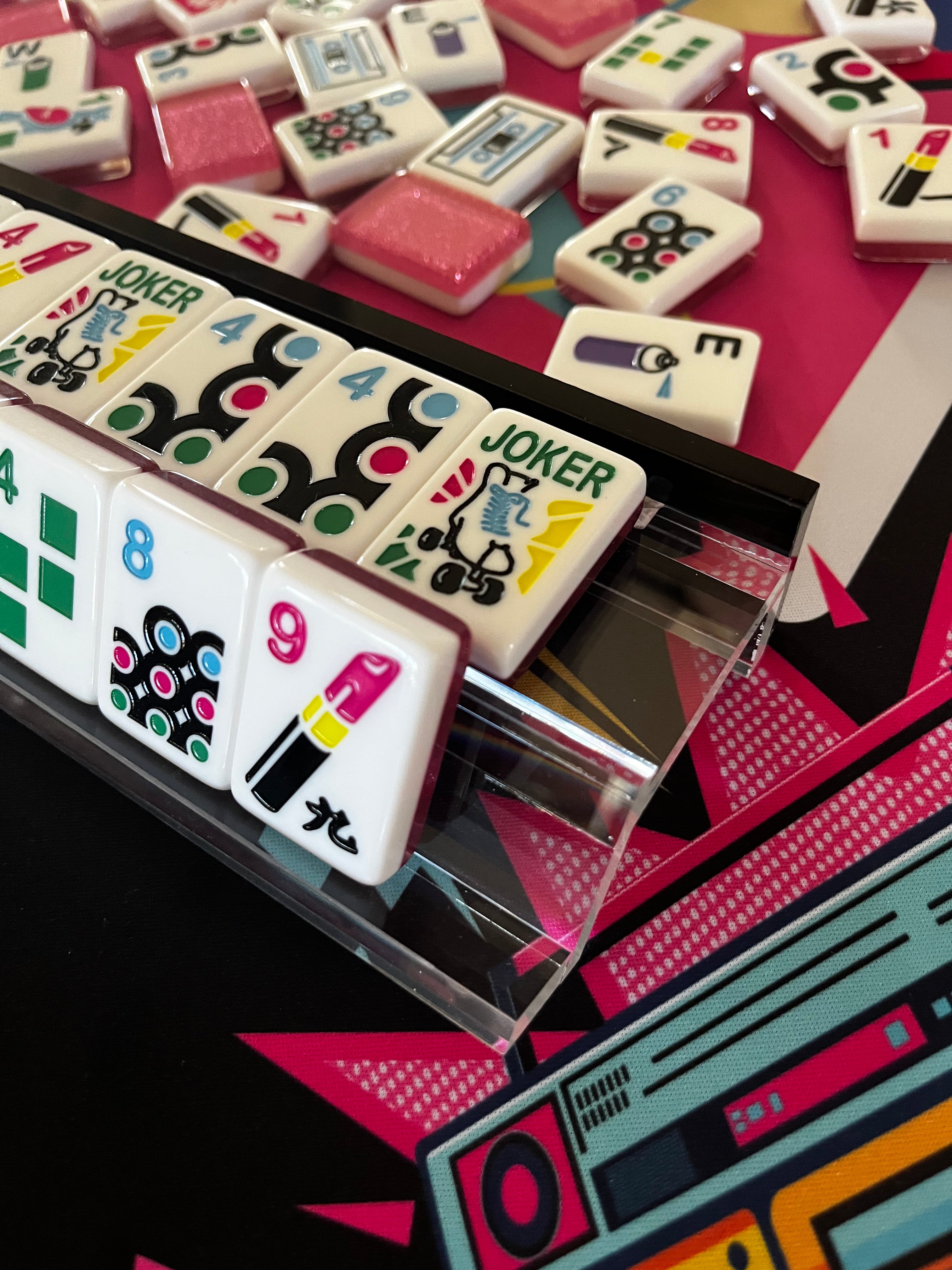 Buy all the mahjong necessities in this bundle at a discounted price! This all-in-one bundle includes the I Love the 80s mahjong set, the coordinated 80s Mat, and (4) 20” premium acrylic racks with magnetic pushers with the choice of four pusher color options. Detachable magnetic pushers allow you to push out your walls with ease and 10 magnets keep the pushers secure against the rack. Includes a 4-slot velvet rack bag.