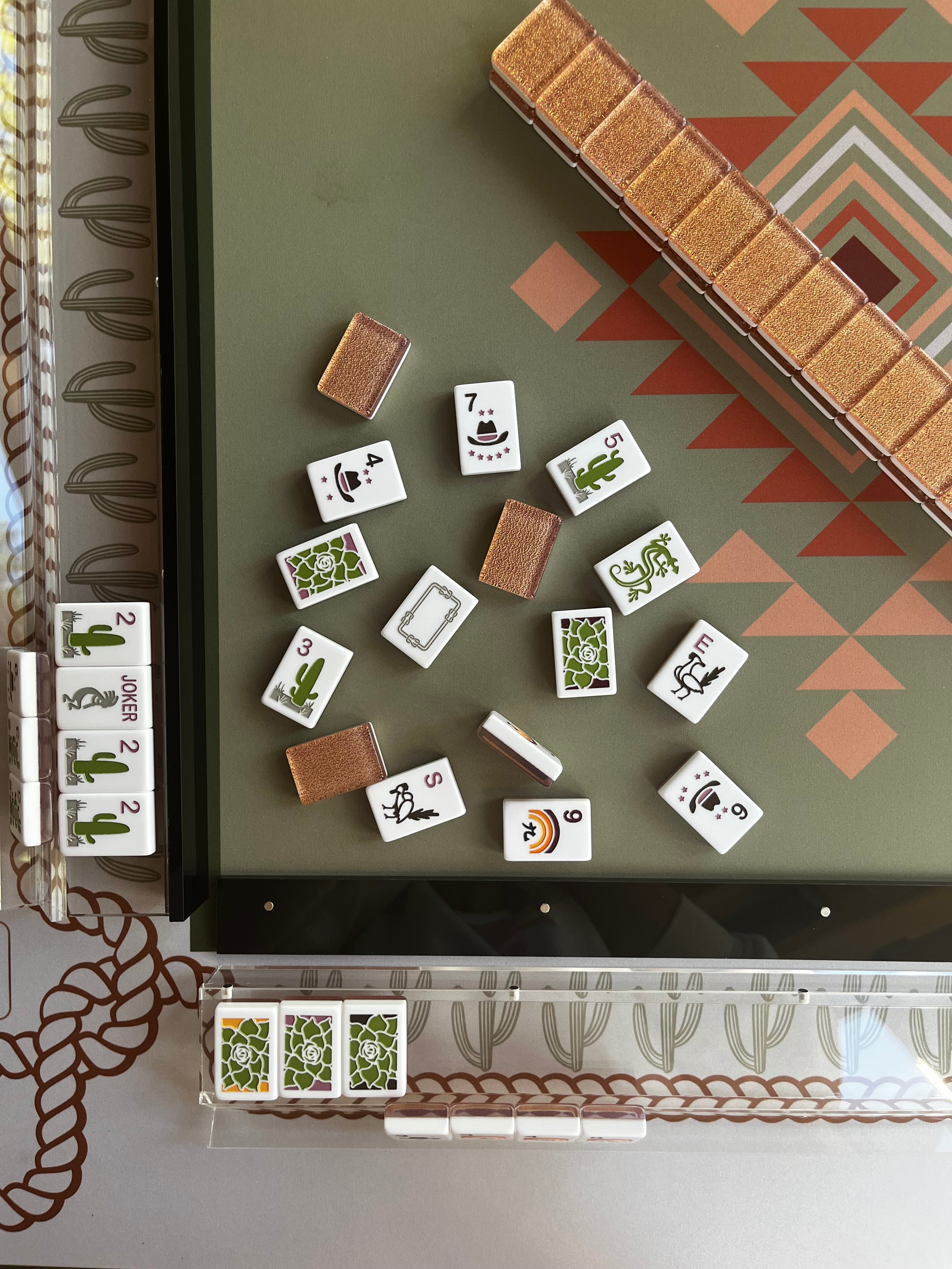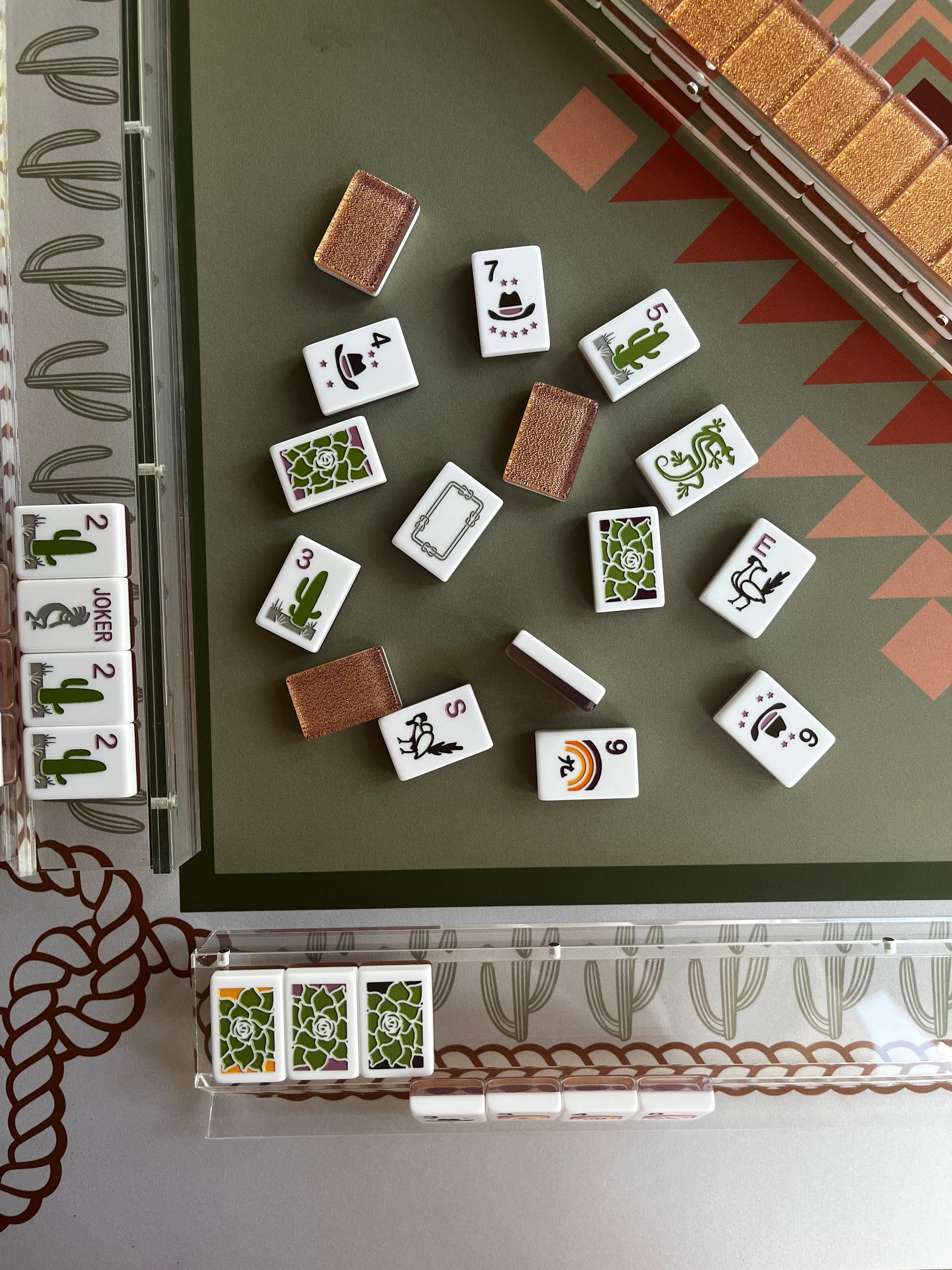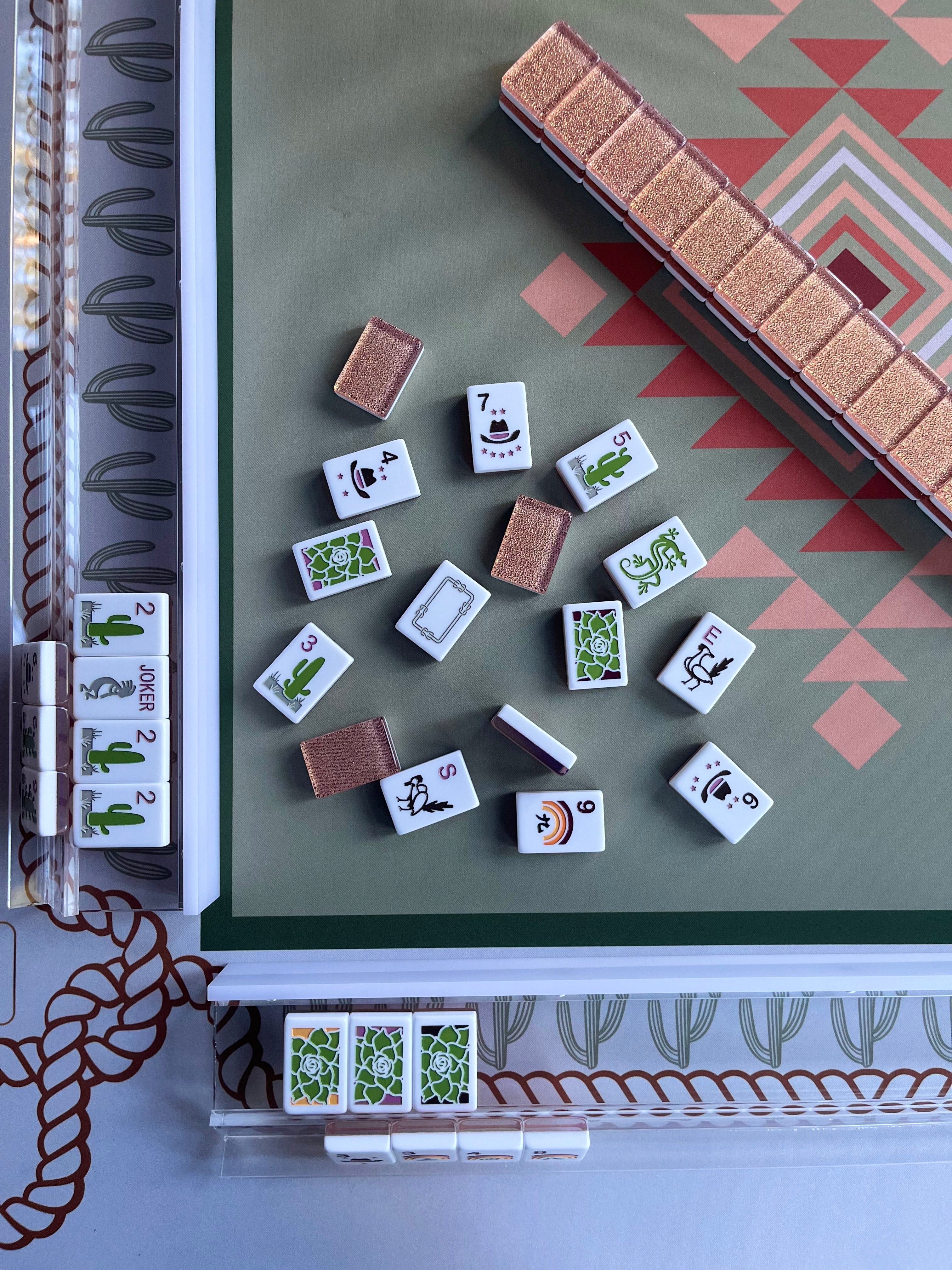 Western Mahjong Set: With earthy tones of sage, rose gold, beige and merlot, Western Luxe was inspired by the desert and love for all things country. Perfect for the player who enjoys a beautiful sunset, appreciates the beauty of the desert landscape, and who may be known to wear a pair of cowboy boots from time to time.