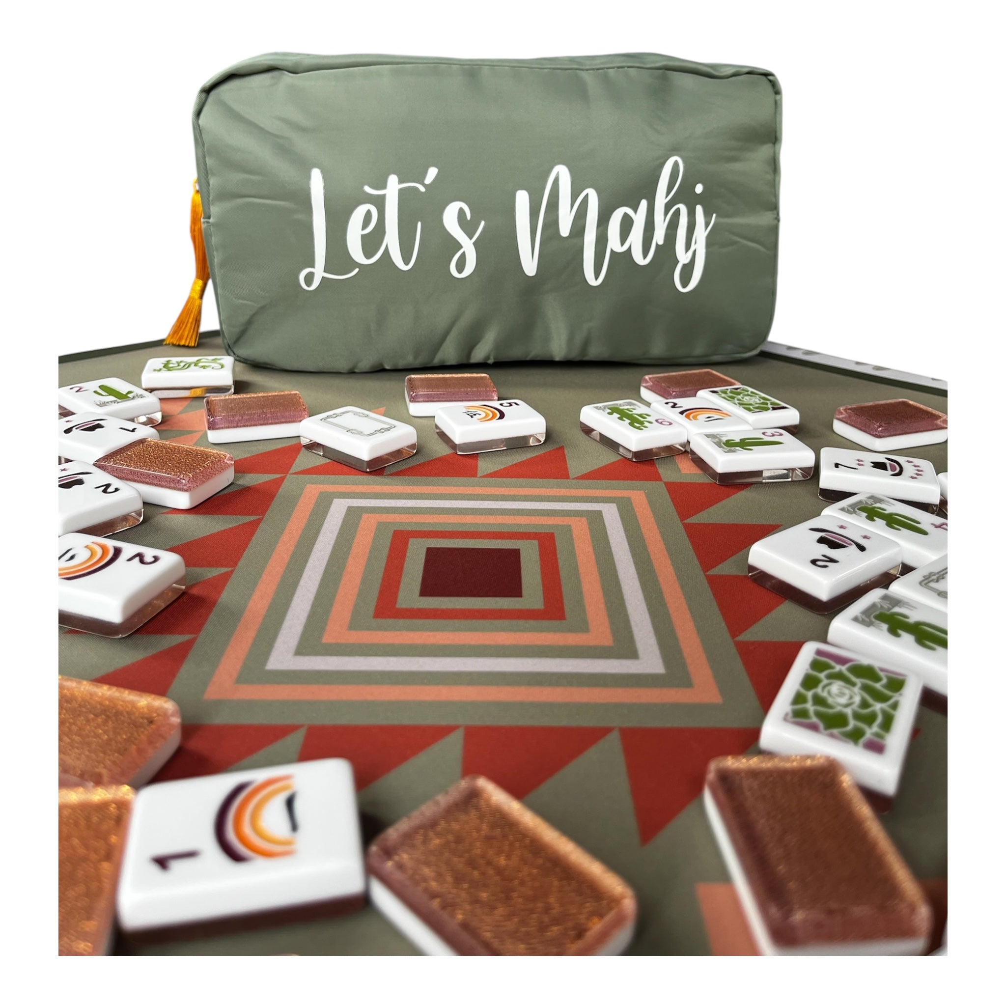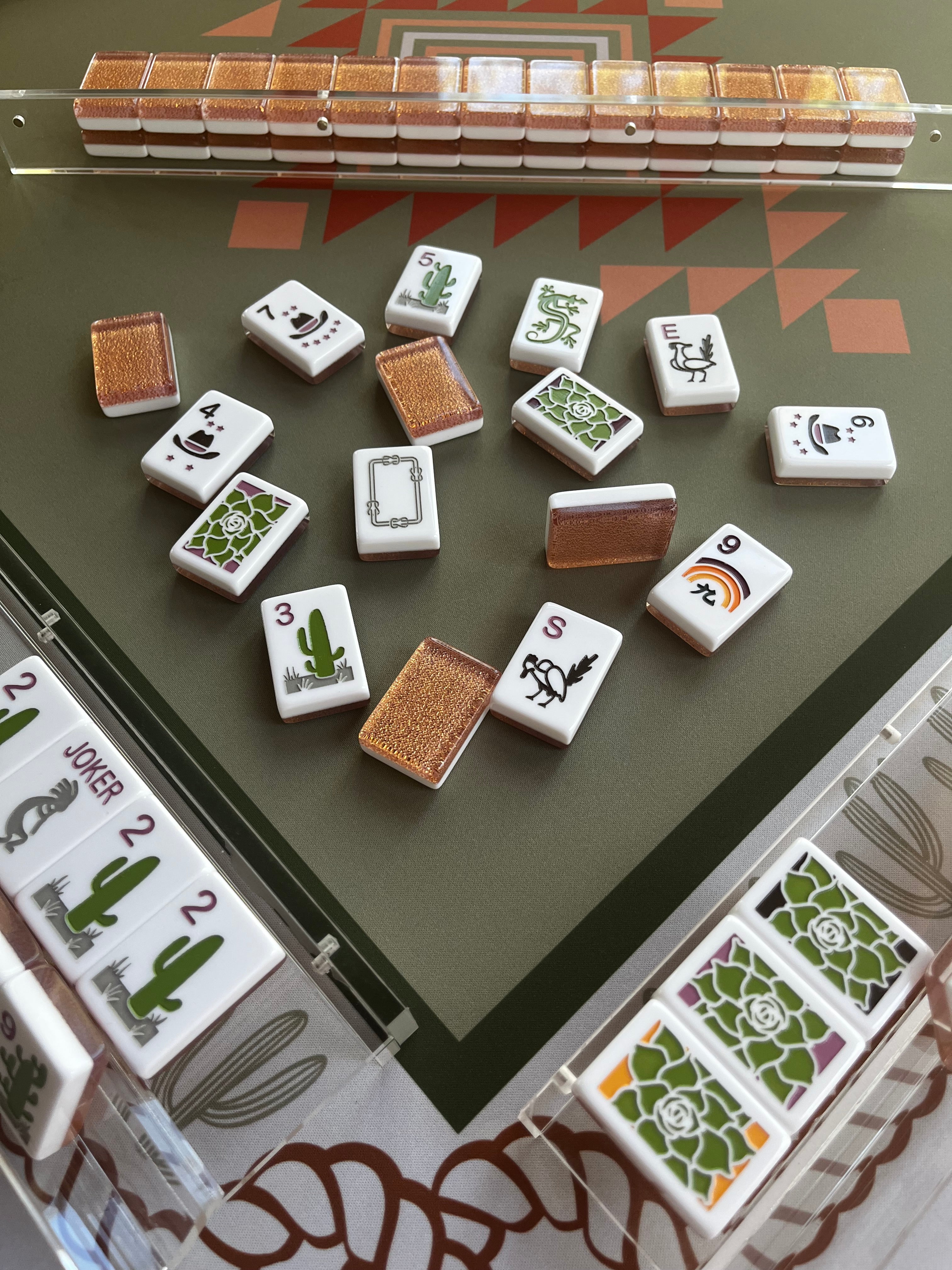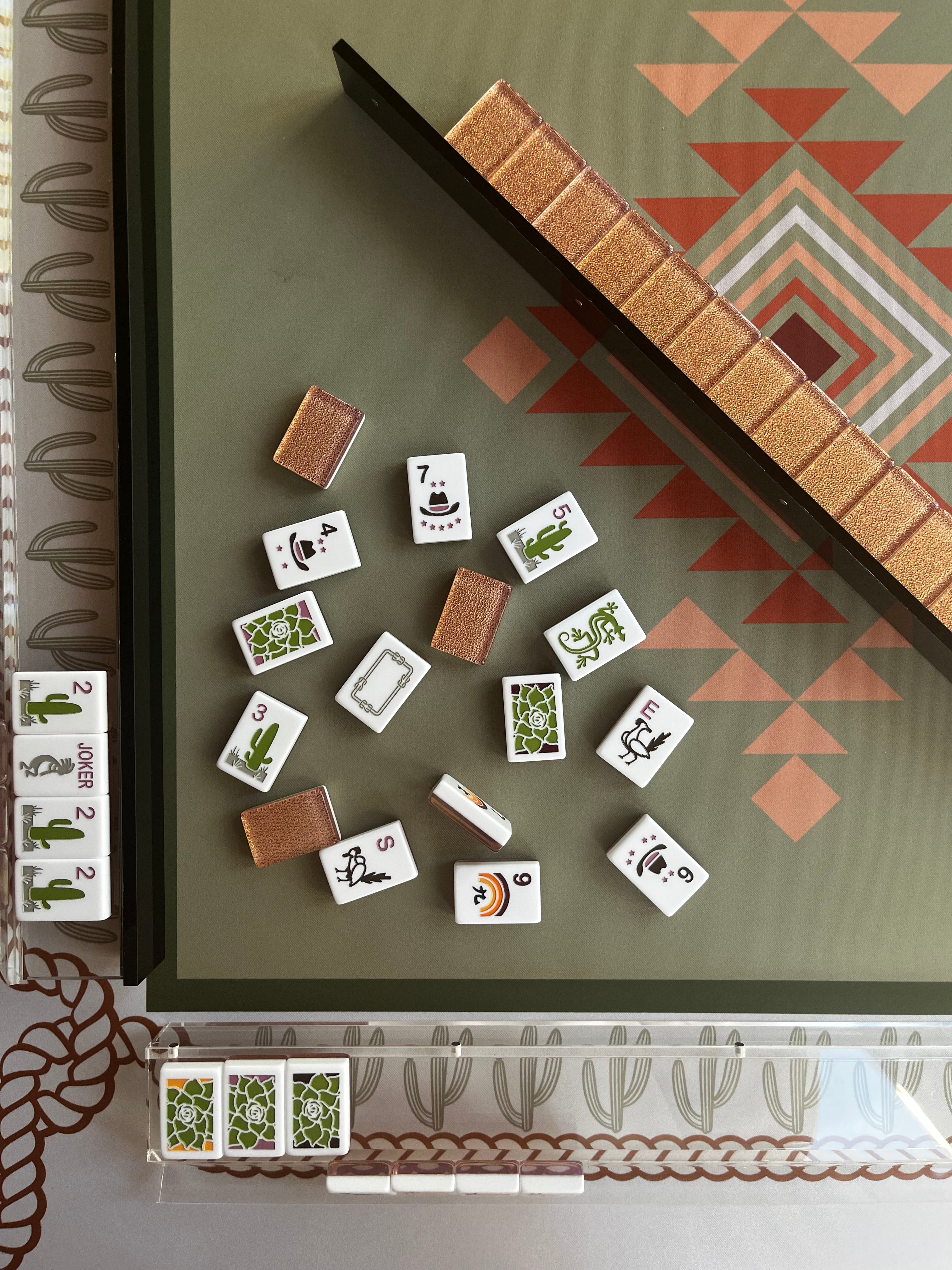 Western Mahjong Set: With earthy tones of sage, rose gold, beige and merlot, Western Luxe was inspired by the desert and love for all things country. Perfect for the player who enjoys a beautiful sunset, appreciates the beauty of the desert landscape, and who may be known to wear a pair of cowboy boots from time to time.